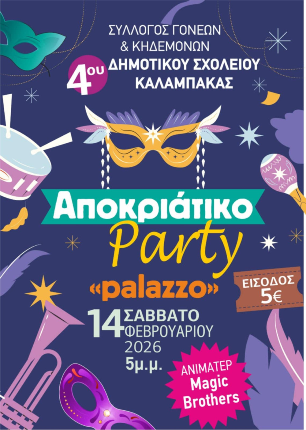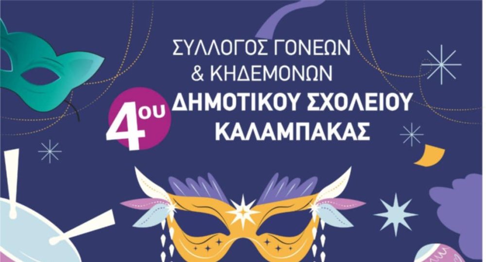Ο Σύλλογος γονέων και κηδεμόνων του 4ου Δημοτικού Καλαμπάκας σας προσκαλεί σε ένα ξέφρενο αποκριάτικο πάρτι γεμάτο κέφι και τρέλα.