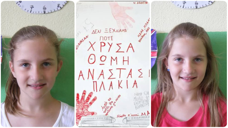 Τις μαθήτριες του σχολείου Χρύσα και Θώμη Πλακιά δεν ξέχασαν και φέτος ο Διευθυντής, οι Εκπαιδευτικοί και ο Σύλλογος Γονέων και Κηδεμόνων του 4ου Δημοτικού Σχολείου Καλαμπάκας κάνοντας την σχετική ανάρτηση στα social media με εικόνες και ζωγραφιές παιδιών για εκείνες..