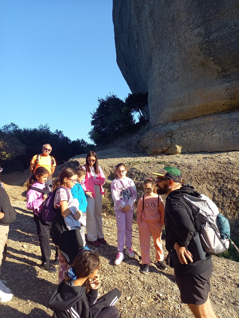 Πολλές φορές σταματούσαμε για να πάρουμε μια ανάσα αλλά και για να ακούσουμε με προσοχή τον κύριο Λάμπρο να μας εξηγεί αυτά που βλέπαμε. Μας μίλησε για τις ονομασίες των βράχων, το παλιό Καστράκι, την ιστορία των μοναστηριών και για όλα τα δέντρα, τα φυτά και τα ζώα που συναντήσαμε. Ιδιαίτερη εντύπωση μάς έκανε μια λακούβα που την είχαν φτιάξει τα αγριογούρουνα . Ο κύριος Χρήστος μάς έδειξε ένα τοξικό μανιτάρι που το λένε Βολιώτη ή Σατανά που όταν το κόβεις, από άσπρο γίνεται γαλάζιο. Ακόμη μας μίλησε για τα είδη των πετρωμάτων και για τον σχηματισμό των μετεωρίτικων βράχων. Μας έδειξε και πώς γίνεται η αναρρίχηση.