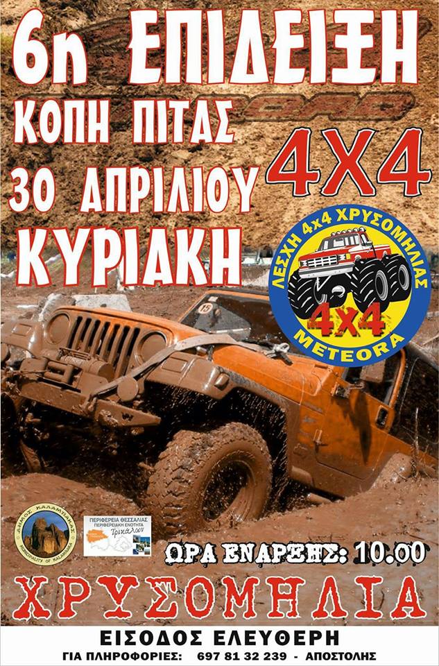 Το διήμερο 29 και 30 Απριλίου θα γίνει στην Χρυσομηλιά Καλαμπάκας η 6η Επίδειξη 4Χ4 η οποία διοργανώνεται από την Λέσχη 4Χ4 Χρυσομηλιάς.