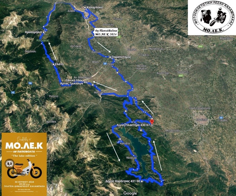 Συνεχίζουμε δυτικά για να φθάσουμε στα Καλύβια και στην Πλαζ Πεζούλας , οπού θα πραγματοποιηθεί και η 1η μας στάση για ανεφοδιασμό καυσίμων ( στο 90ο χλμ ) και καφέ. Οδηγούμε Νότια έως το Φράγμα οπού και θα κάνουμε ολιγόλεπτη στάση για τις απαραίτητες φωτογραφίες. Κατόπιν συνεχίζουμε προς τα Βόρεια και τα χωριά Αγ. Αθανάσιος , Μεσενικόλας και Μορφοβούνι για να συναντήσουμε την Επαρχιακή Οδό που οδηγεί στην Καρδίτσα. Λίγο πριν το χωριό Μητρόπολη θα στρίψουμε αριστερά προς Άγιο Ακάκιο και περνώντας από τον Πύργο Ιθώμης θα κατέβουμε στην Επαρχιακή οδό προς Μουζάκι . Εδώ θα γίνει ο 2ος ανεφοδιασμός καυσίμου ( στο 170ο χλμ) . Συνεχίζουμε κινούμενοι προς Πύλη και κατόπιν ανηφορίζουμε προς Ελάτη στην οποία θα γίνει η μεγάλη μας στάση για ξεκούραση και φαγητό, διάρκειας 2 ωρών . Θα κλείσουμε την βόλτα μας περνώντας από τα Περτουλιώτικα λιβάδια , κατεβαίνοντας την Χρυσομηλιά έως το Μουργκάνι και πίσω στην πόλη μας.