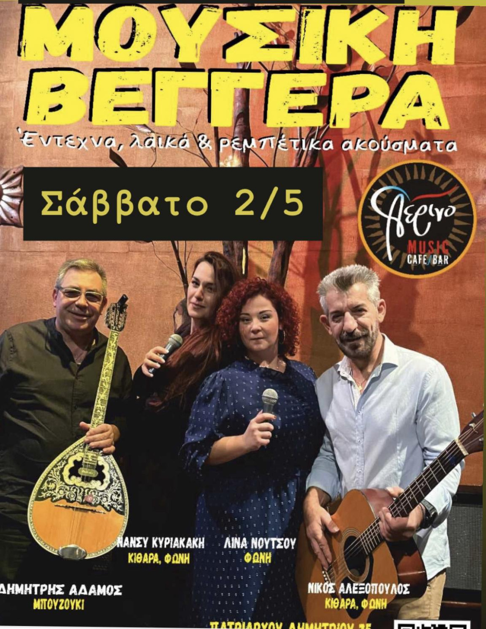 Αυτό το Σάββατο 2/5 το τελευταίο live με την “Μουσική Βεγγέρα’ για την φετινή σεζόν στο Μουσικό καφέ ΑΕΡΙΝΟ.