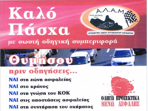 Μέλη της ΑΛΑΜ την Μεγάλη Παρασκευή και το Μεγάλο Σάββατο θα βρίσκονται από το πρωί στην είσοδο και στην έξοδο της πόλης μας και θα μοιράσουν στους διερχόμενους οδηγούς φυλλάδια με συμβουλές για ασφαλή οδήγηση και σωστή οδική συμπεριφορά.