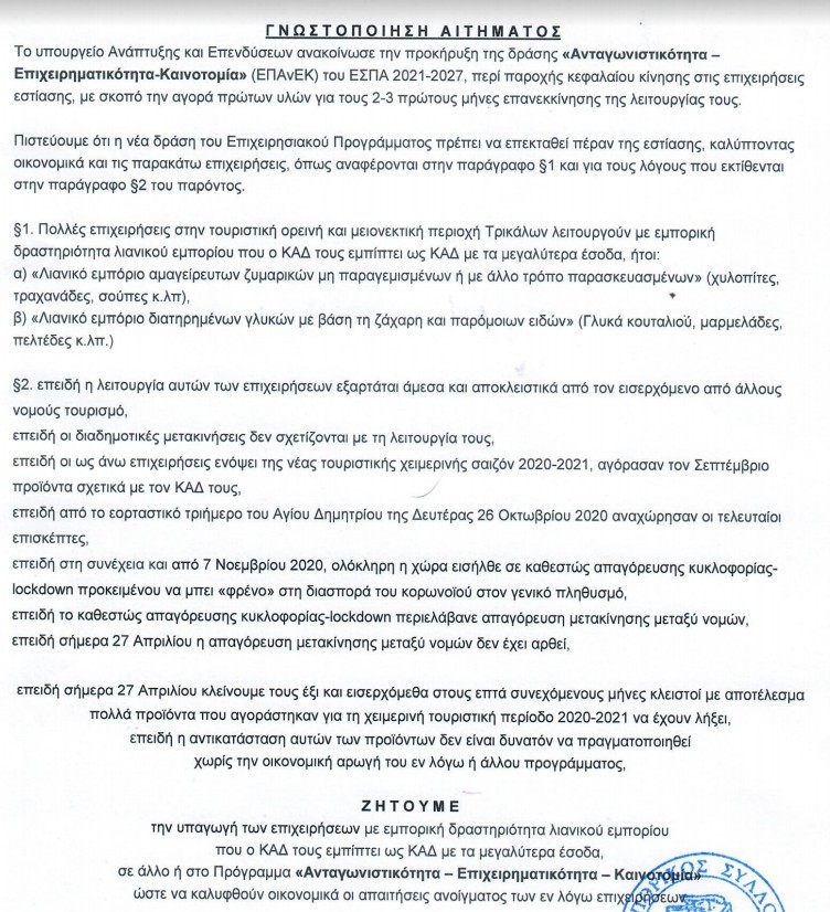 Σας διαβιβάζουμε την επιστολή με τα δίκαια αιτήματα του Εμπορικού Συλλόγου Πύλης  και παρακαλούμε όπως μεριμνήσετε άμεσα, είτε για την τροποποίηση της δράσης «Επιδότηση κεφαλαίου κίνησης σε επιχειρήσεις εστίασης για την προμήθεια πρώτων υλών» προσθέτοντας στους επιλέξιμους ΚΑΔ τους κωδικούς δραστηριοτήτων όπως περιγράφονται στην επισυναπτόμενη επιστολή είτε για την άμεση προκήρυξη νέου χρηματοδοτικού προγράμματος οικονομικής ενίσχυσης των επιχειρήσεων αυτών.