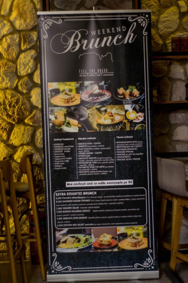 Κάθε Σάββατο και Κυριακή από τις 09.00 μέχρι τις 17.00 το kitchen team του FEEL THE ROCKS επιμελείται ένα μενού αλμυρών και γλυκών εδεσμάτων και οι έμπειροι baristas ετοιμάζουν μοναδικά ροφήματα, αρωματικούς καφέδες, φυσικούς χυμούς και υπό τους ήχους απαλής μουσικής δημιουργούν την πιο ειδυλλιακή ατμόσφαιρα για μια εμπειρία διαφορετική από τις συνηθισμένες: την εμπειρία «FeelTheRocksBrunchWeekend Event»