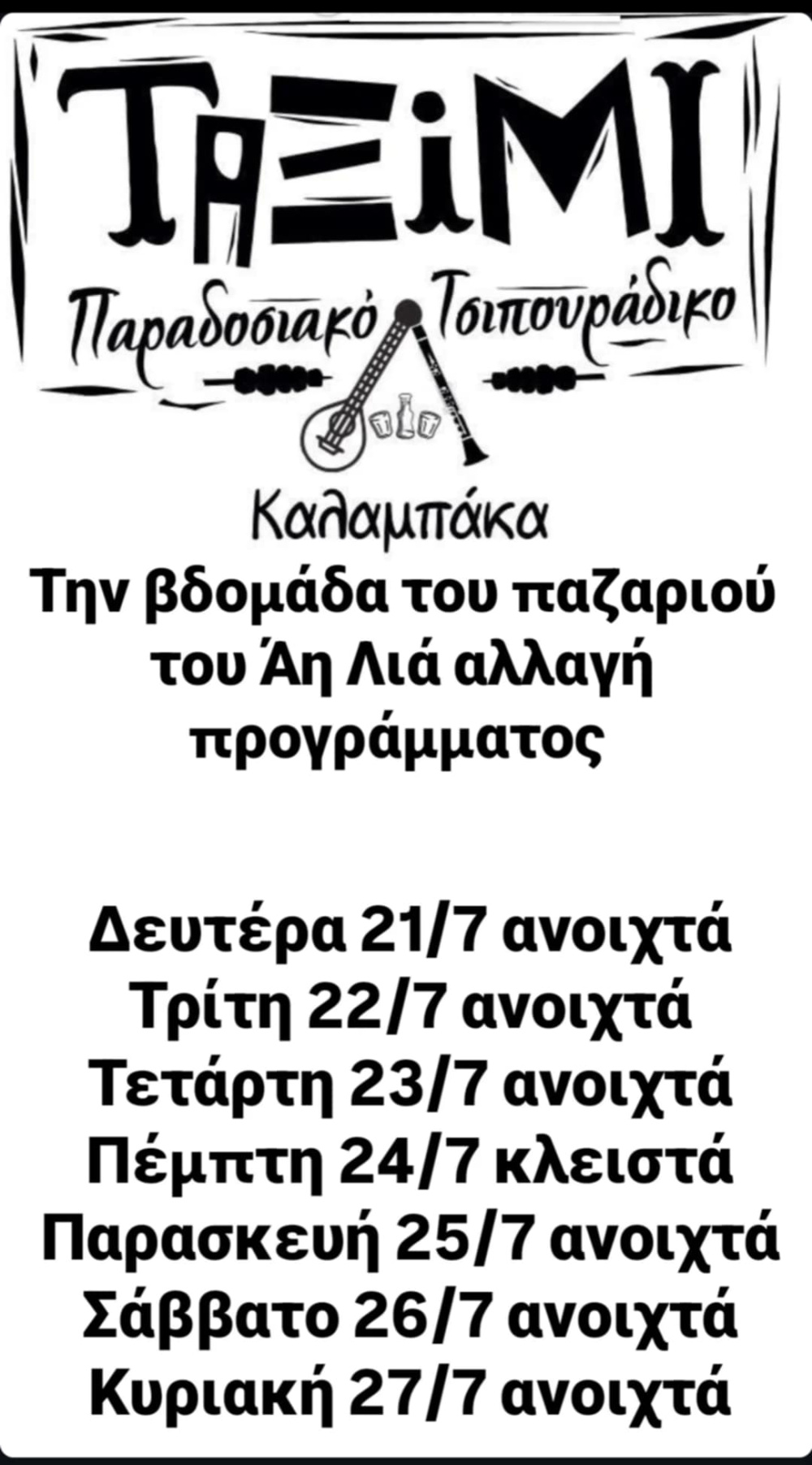Το παραδοσιακό τσιπουράδικο “ΤαΞιΜι” στην Καλαμπάκα ενημερώνει το κοινό του για αλλαγή στο πρόγραμμα λειτουργίας κατά την εβδομάδα του παζαριού του Άη Λιά.