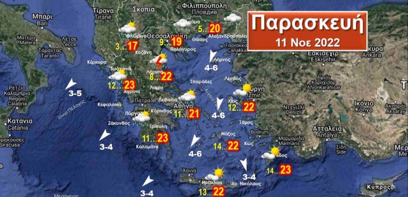 Άνεμοι: Βοριάδες ασθενείς έως μέτριοι 3-5, στο Αιγαίο ισχυροί έως 6 Μποφόρ. Θερμοκρασίες: Στη βόρεια Ελλάδα από 3 έως 19, στη δυτική, την κεντρική, τη νότια και τα νησιά από 8 έως 21-23 βαθμούς.