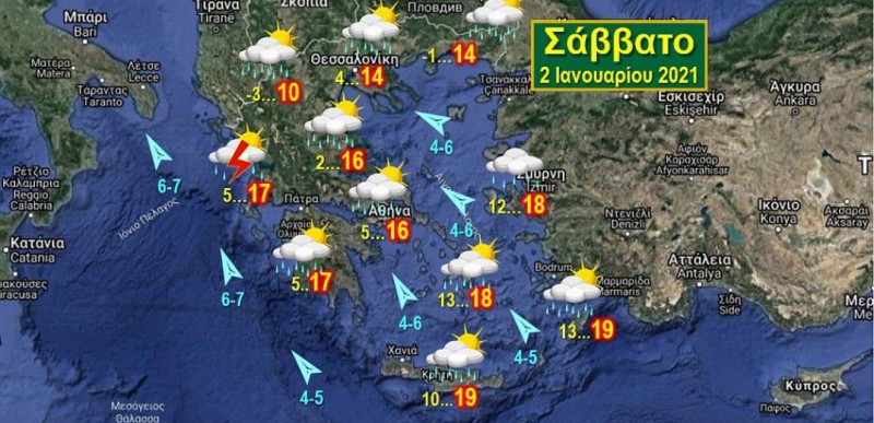 Σάββατο, 2-1-2021 – Αλλαγή του καιρού με συννεφιά και βροχές αρχικά στο ανατολικό Αιγαίο και το Ιόνιο και από το απόγευμα και τη βράδυ βροχές στις περισσότερες περιοχές της χώρας. Χιονοπτώσεις αναμένονται στα κεντρικά και βόρεια ορεινά.