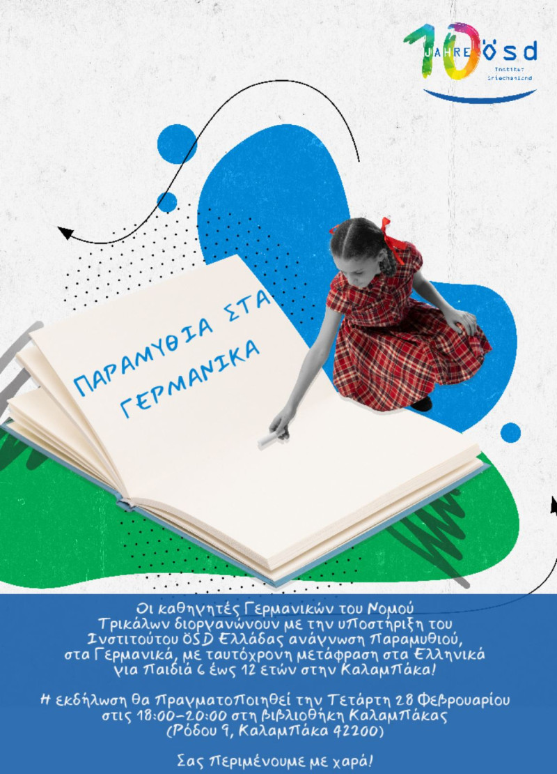 Η Τοπική Επιτροπή Καθηγητών Γερμανικών Νομού Τρικάλων διοργανώνει με την υποστήριξη του Ινστιτούτου ÖSD Ελλάδας ανάγνωση παραμυθιού για παιδιά 6-12 ετών, την Τετάρτη, 28 Φεβρουαρίου στις 18:00 -20:00 στη Βιβλιοθήκη Καλαμπάκας, με ελεύθερη είσοδο.