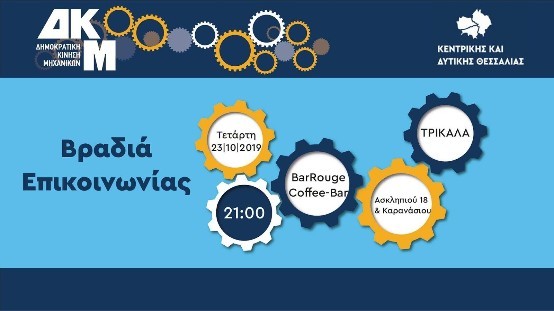 Θα αποτελέσει ιδιαίτερη τιμή για εμάς η παρουσία των συναδέλφων μηχανικών αύριο Τετάρτη 23 Οκτωβρίου στις 21:00 στο BarRouge στη βραδιά επικοινωνίας της Δημοκρατικής Κίνησης Μηχανικών.