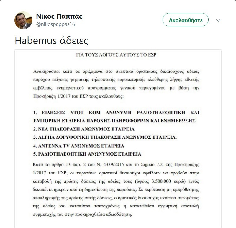 Τις πέντε τηλεοπτικές άδειες ανακοίνωσε μέσα από το Twitter ο υπουργός Ψηφιακής Πολιτικής, Νίκος Παππάς.