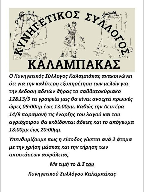 Ο Κυνηγετικός Σύλλογος Καλαμπάκας ανακοινώνει ότι για την καλύτερη εξυπηρέτηση των μελών για την έκδοση αδειών θήρας το Σαββατοκύριακο 12 και 13/9 τα γραφεία μας θα είναι ανοιχτά πρωινές ώρες 09:00 π.μ. έως 13:00 μ.μ.
