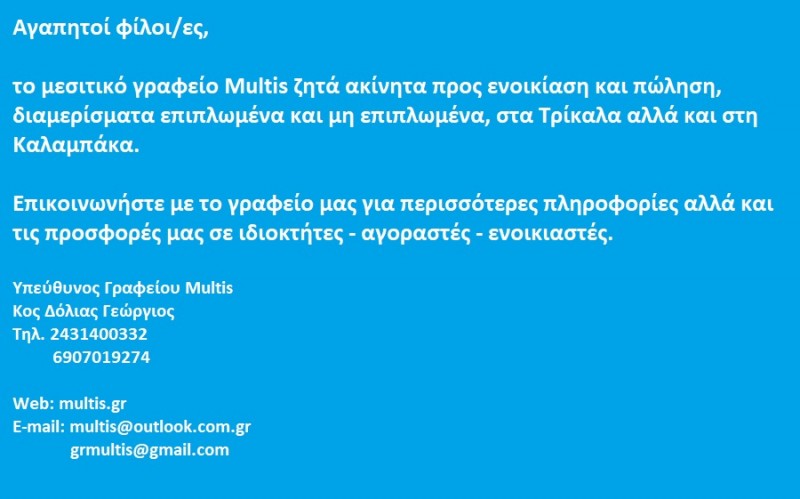 Αγαπητοί φίλοι/ες το μεσιτικό γραφείο MULTIS ζητά ακίνητα προς ενοικίαση και πώληση, διαμερίσματα επιπλωμένα και μη επιπλωμένα, στα Τρίκαλα και στη Καλαμπάκα.