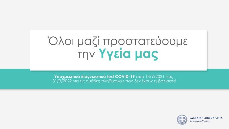 Για το διάστημα 13 Σεπτεμβρίου του 2021 ως 31 Μαρτίου του 2022 θα ισχύσουν μέτρα υποχρεωτικής διάγνωσης Covid-19 για όσους δεν έχουν εμβολιαστεί.