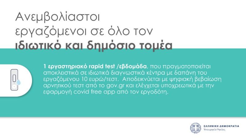 Οι ανεμβολίαστοι εκπαιδευτικοί και ακαδημαϊκοί, όπως και οι εργαζόμενοι σε τουρισμό, εστίαση, τηλεοπτικές, κινηματογραφικές, θεατρικές, μουσικές και χορευτικές παραγωγές θα πρέπει να κάνουν δύο εργαστηριακά rapid test αντιγόνου κάθε εβδομάδα.