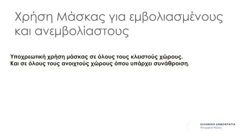 Τέλος, αλλά όχι τελευταίο, σε όλους τους εσωτερικούς χώρους αλλά και στους εξωτερικούς που υπάρχει συνάθροιση, θα πρέπει να υπάρχει σήμανση και υπενθύμιση για χρήση μάσκας.