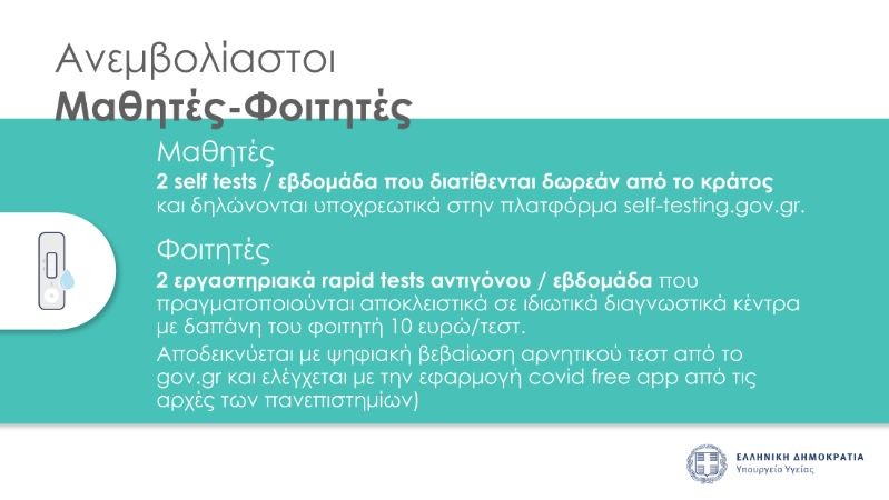 Οι ανεμβολίαστοι μαθητές και φοιτητές. Σε ό,τι έχει να κάνει με τους μαθητές υποχρεωτικά είναι τα δύο self test την εβδομάδα τα οποία όμως διατίθενται δωρεάν από το κράτος και δηλώνονται υποχρεωτικά στην πλατφόρμα selftesting.gov.gr.