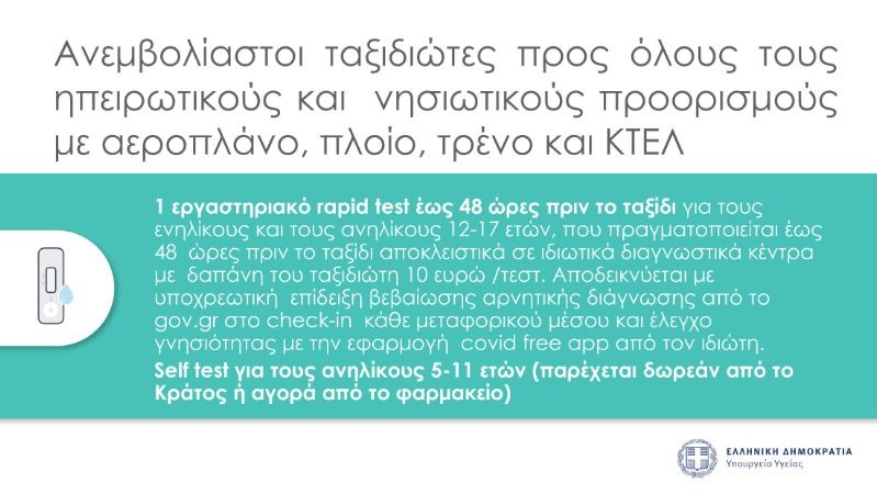 Σε ό,τι έχει να κάνει με τους ανεμβολίαστους ταξιδιώτες προς όλους τους ηπειρωτικούς και νησιωτικούς προορισμούς της επικράτειας με αεροπλάνο, πλοίο, τρένο και ΚΤΕΛ, υποχρεούνται σε ένα εργαστηριακό rapid test αντιγόνου έως 48 ώρες πριν το ταξίδι προς νησιά για τους ενήλικους και ανήλικους 12-17 ετών.