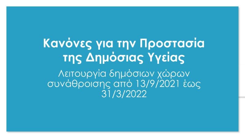 Πάμε στους δημόσιους χώρους. Ως προς την ομαλή λειτουργία δημόσιων χώρων συνάθροισης, οι κανόνες δημόσιας υγείας που θα ισχύσουν για την ίδια χρονική περίοδο δηλαδή από τις 13 Σεπτεμβρίου έως την 31η Μαρτίου του 2022 θα είναι ανάλογη με τις κατηγορίες δραστηριοτήτων.