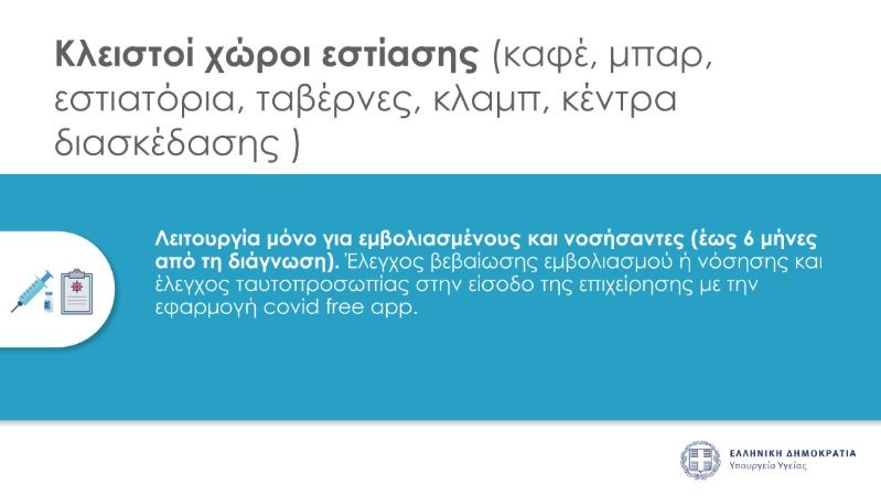 Στους κλειστούς χώρους εστίασης, καφέ, μπαρ, εστιατόρια, ταβέρνες, κλαμπ, κέντρα διασκέδασης και ούτω καθεξής, έχουμε λειτουργία μόνο για εμβολιασμένους και νοσήσαντες έως 6 μήνες από τη διάγνωση. Έλεγχο βεβαίωσης εμβολιασμού ή νόσησης και έλεγχο ταυτοπροσωπίας στην είσοδο της επιχείρησης με την εφαρμογή covid free up.