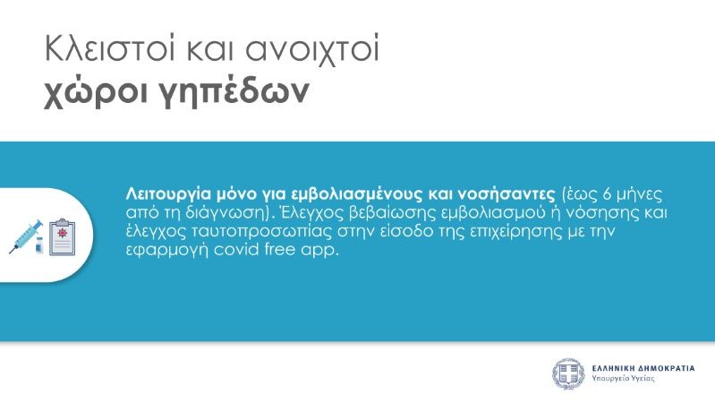 Στους κλειστούς και ανοιχτούς χώρους γηπέδων, αθλοπαιδιών κλπ., έχουμε λειτουργία μόνο για εμβολιασμένους και νοσήσαντες έως 6 μήνες από τη διάγνωση. Έλεγχο βεβαίωσης εμβολιασμού ή νόσησης και έλεγχο ταυτοπροσωπίας στην είσοδο της επιχείρησης με την εφαρμογή covid free up.