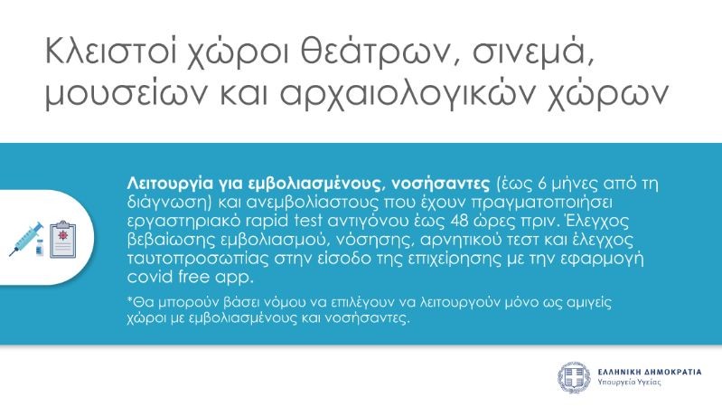 Στους κλειστούς χώρους θεάτρων, κινηματογράφων, μουσείων και αρχαιολογικών χώρων, έχουμε λειτουργία για εμβολιασμένους νοσήσαντες έως 6 μήνες από τη διάγνωση, αλλά και ανεμβολίαστους που έχουν πραγματοποιήσει εργαστηριακό rapid test αντιγόνου έως 48 ώρες πριν.