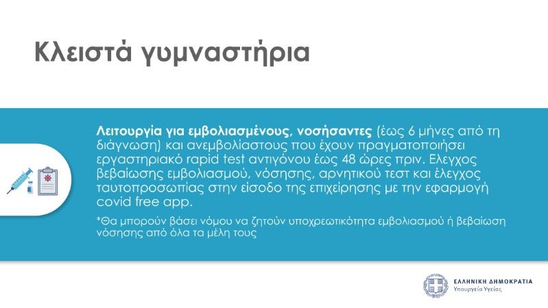 Σε ό,τι έχει να κάνει με τα αθλητικά σωματεία και τα κλειστά γυμναστήρια. Θα έχουμε λειτουργία για εμβολιασμένους/νοσήσαντες έως 6 μήνες από τη διάγνωση αλλά και ανεμβολίαστους που έχουν πραγματοποιήσει εργαστηριακό rapid test αντιγόνου έως 48 ώρες πριν.
