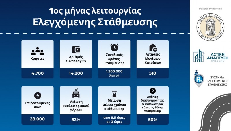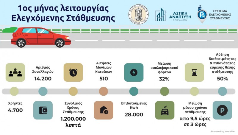 Η πόλη «αναπνέει» με τη χρήση του Συστήματος Ελεγχόμενης Στάθμευσης και ταυτοχρόνως 28.000 κιλοβατώρες θα αποδοθούν σε μέλη ευπαθών ομάδων. Αυτά είναι δύο από τα βασικά στοιχεία του ΣΕΣ που υλοποιούν ο Δήμος Τρικκαίων και η δημοτική εταιρεία «Αστική Ανάπτυξη» από τα μέσα Οκτωβρίου 2022. Έναν μήνα μετά, τα δεδομένα του πρώτου μήνα λειτουργίας του νέου Συστήματος (ΣΕΣ) αποδεικνύουν ότι επιτεύχθηκε ο βασικός στόχος, η μείωση του κυκλοφοριακού φόρτου στα Τρίκαλα κατά 32%, όπως προκύπτει από τους αισθητήρες μέτρησης της κίνησης που ο Δήμος έχει εγκαταστήσει. Αυτό σημαίνει, λιγότερο καυσαέριο και μικρότερη ταλαιπωρία για εύρεση χώρου στάθμευσης, όπως αποδεικνύεται από ένα άλλο στοιχείο: μειώθηκε και κατά 6,5 ολόκληρες ώρες ο χρόνος στάθμευσης, από 9,5 σε μόλις 3 ώρες. Αντίστοιχα, αυξήθηκε η πιθανότητα να βρεθεί θέση στάθμευσης από καταναλωτές κατά 50%.