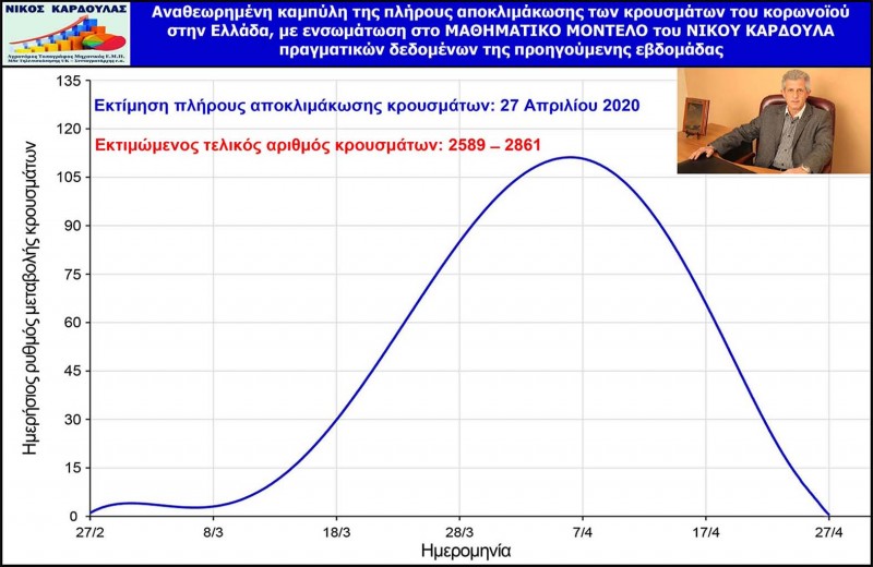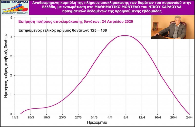 Σε δημοσιεύσεις μου την περασμένη εβδομάδα, είχε εκτιμηθεί με το μαθηματικό μου μοντέλο ότι η πλήρης αποκλιμάκωση των κρουσμάτων της νόσου του κορωνοϊού στην Ελλάδα, θα συμβεί στις 6 Μαΐου, ενώ των θανάτων στις 24 Απριλίου. Οι συγκεκριμένες έρευνες ήταν μία μαθηματική προσέγγιση, χρησιμοποιώντας δεδομένα έως τις 5 Απριλίου.