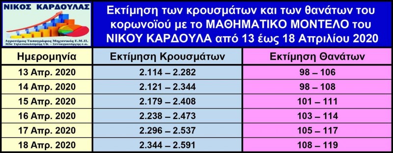 Με την παραπάνω προσομοίωση του μαθηματικού μοντέλου έγιναν και αντίστοιχες εκτιμήσεις των καθημερινών κρουσμάτων και θυμάτων στη χώρα μας για την τρέχουσα εβδομάδα, από σήμερα έως τις 18 Απριλίου και φαίνονται στον παρακάτω πίνακα.