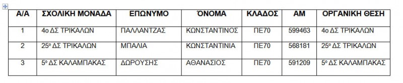 Αναθέτουμε την προσωρινή άσκηση καθηκόντων Διευθύντριας/-ντή στους παρακάτω εκπαιδευτικούς, σε κενές και κενούμενες θέσεις Διευθυντριών/-ντών σχολικών μονάδων της Δ.Π.Ε. Τρικάλων, από 03-09-2021, έως την έκδοση της σχετικής κανονιστικής Υπουργικής Απόφασης και όχι πέραν της λήξης του διδακτικού έτους 2021-2022, ως εξής: