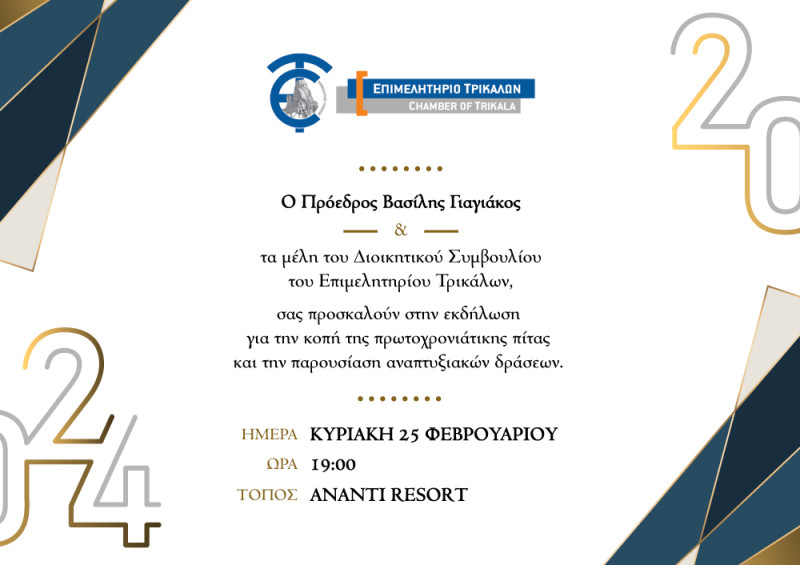 Ανοιχτή πρόσκληση προς όλους, απευθύνουν ο πρόεδρος Βασίλης Γιαγιάκος και τα μέλη του Διοικητικού Συμβουλίου του Επιμελητηρίου Τρικάλων για την εκδήλωση κοπής της πρωτοχρονιάτικης πίτας και παρουσίασης στοχευμένων αναπτυξιακών δράσεων.