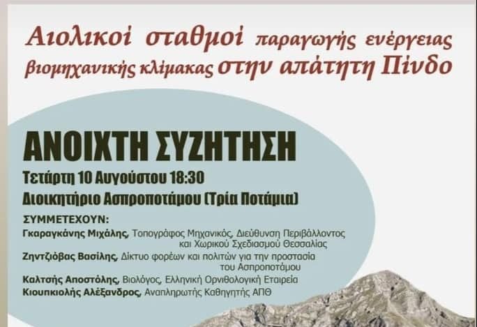 Ανοιχτή συζήτηση για τους αιολικούς σταθμούς παραγωγής ενέργειας βιομηχανικής κλίμακας στην απάτητη Πίνδο θα πραγματοποιηθεί στις 10 Αυγούστου στις 18:30 στο Διοικητήριο Ασπροποτάμου