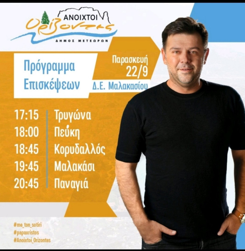 ΑΝΟΙΧΤΟΙ ΟΡΙΖΟΝΤΕΣ: Το πρόγραμμα επισκέψεων του Σωτήρη Παπαχρήστου την Παρασκευή 22/9 Τοπικές Ειδήσεις Από admin Δημοσίευση Σεπ 19, 2023 -22:04 0 526 Κοινοποίηση FacebookTwitterΗλεκτρονικό ΤαχυδρομείοViber Ανακοινώθηκε το πρόγραμμα επισκέψεων του Υποψηφίου Δημάρχου Δήμου Μετεώρων Σωτήρη Παπαχρήστου για την Παρασκευή 22/9. Το πρόγραμμα έχει ως εξής: 0 526 Κοινοποίηση