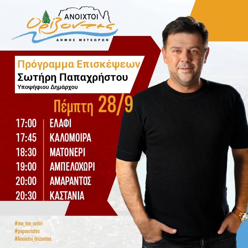 Ανακοινώθηκε το πρόγραμμα επισκέψεων του Υποψηφίου Δημάρχου Δήμου Μετεώρων Σωτήρη Παπαχρήστου για την Πέμπτη 28/9