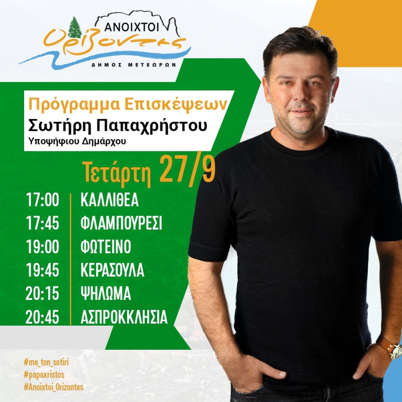 Ανακοινώθηκε το πρόγραμμα επισκέψεων του Υποψηφίου Δημάρχου Δήμου Μετεώρων Σωτήρη Παπαχρήστου για την Τετάρτη 27/9