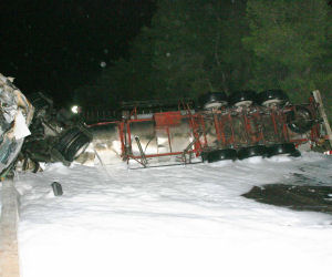 Η διαρροή, που παρατηρήθηκε στο όχημα, ανάγκασε τους πυροσβέστες να κινηθούν πολύ γρήγορα. Τα ξημερώματα, συνεργείο ξεκίνησε μετάγγιση του εύφλεκτου υλικού σε άλλο φορτηγό και ακολούθως έφτασε γερανός για να το απομακρύνει.