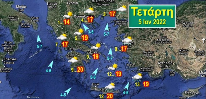 Άνεμοι: Νοτιάδες 4-6 Μποφόρ, στο βόρειο Ιόνιο και το βόρειο Αιγαίο 6-7 Μποφόρ. Θερμοκρασίες: Στη βόρεια και κεντρική χώρα από 1 έως 19, στη δυτική και νότια από 7 έως 20, στα νησιά από 12 έως 20 βαθμούς.