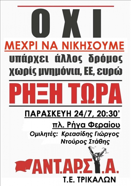 Ανοιχτή εκδήλωση-συζήτηση της ΑΝΤ.ΑΡ.ΣΥ.Α. Τρικάλων στην Πλατεία Ρήγα Φεραίου στα Τρίκαλα, την Παρασκευή 24 Ιουλίου, 8:30 μ.μ.,