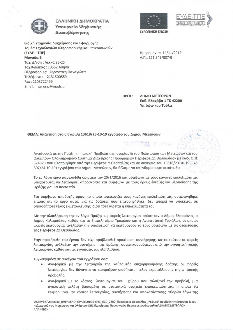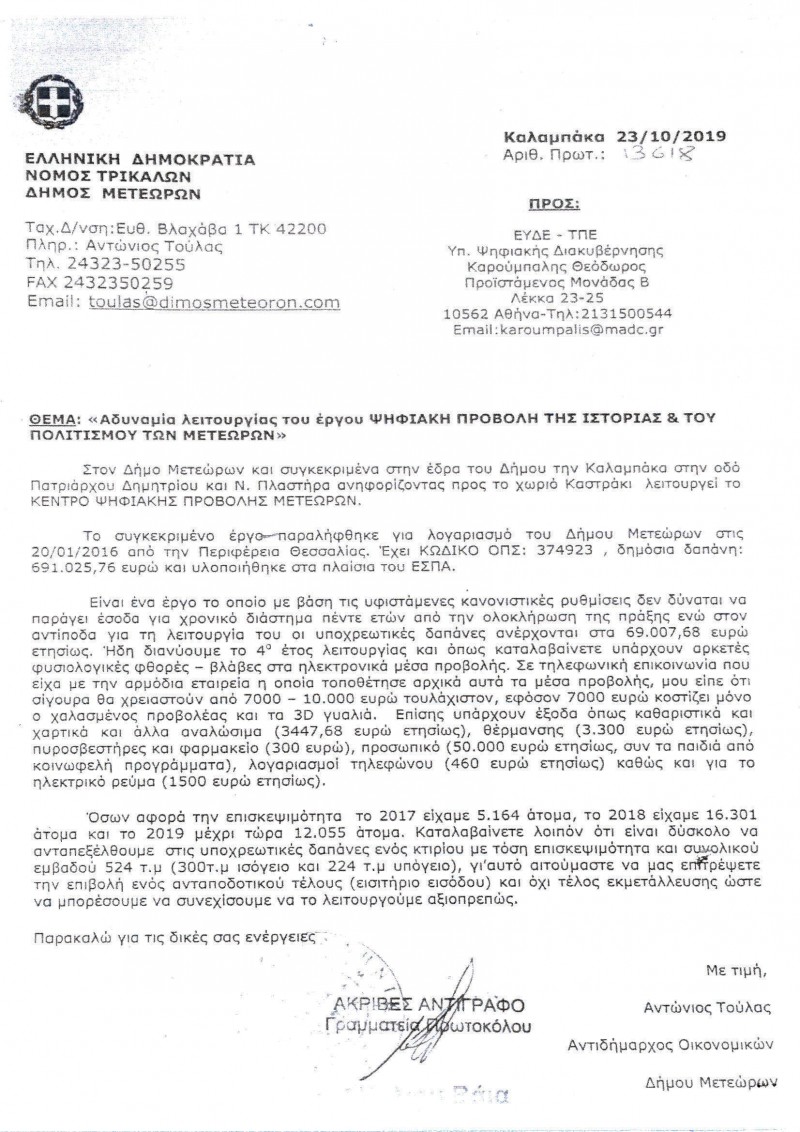 Το έγγραφο που εστάλη από τον αρμόδιο Αντιδήμαρχο Οικονομικών Δήμου Μετεώρων κ. Αντώνη Τούλα στο Υπουργείο Ψηφιακής Διακυβέρνησης σχετικά με την αδυναμία λειτουργίας του Έργου Ψηφιακή Προβολή της Ιστορίας και του Πολιτισμού των Μετεώρων εστάλη και δημοσιεύεται η παρακάτω καθώς και η απάντηση που έλαβε από το αρμόδιο υπουργείο.