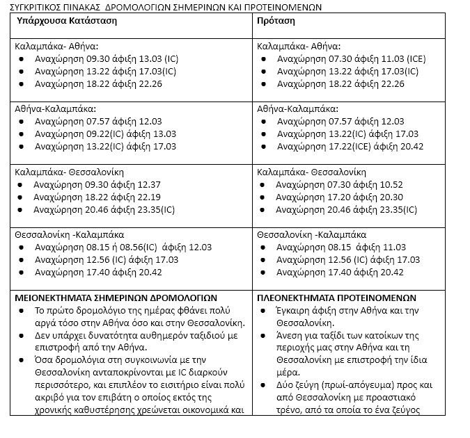 Η αποδοχή των προτάσεών μας, που επαναλαμβάνουμε ότι είναι απολύτως συμβατές με το νέο πλέγμα δρομολογίων, εξασφαλίζει στους κατοίκους της περιοχής μας ημερησίως δύο δυνατότητες ταξιδιού για τη Θεσσαλονίκη και τρεις για την Αθήνα, που είναι η ελάχιστη υπηρεσία την οποία πραγματικά δικαιούται να έχει ο κάτοικος της Δυτικής Θεσσαλίας, εξυπηρετώντας παράλληλα τους επισκέπτες προς τα Μετέωρα. Με στοιχεία που καταδεικνύουν το βαθμό πληρότητας των αμαξοστοιχιών, είναι σχεδόν σίγουρο ότι θα αποφέρουν περισσότερα οφέλη- κέρδη στην ΤΡΑΙΝΟΣΕ, θα ενισχύσουν τον κοινωνικό ρόλο της εταιρείας, θα ενδυναμώσουν την εμπιστοσύνη των πολιτών προς την εταιρεία, θα προάγουν τη χρήση φιλικών προς το περιβάλλον μέσων μετακίνησης.