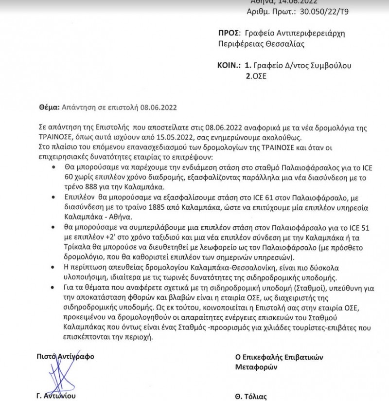 Παράλληλα , με την ευκαιρία της επιστολής μου σας κάνω γνωστό ότι με την αλλαγή των δρομολογίων , οι κάτοικοι της Περ. Ενότητας Τρικάλων είναι αδύνατο να μεταβούν στην Αθήνα για διεκπεραίωση υποθέσεων τους χωρίς διανυκτέρευση . Ζητούμε να επανέλθει η πρωινή γραμμή προς Αθήνα και να υπάρχει ανταπόκριση με το «ασημένιο βέλος ¨στο Παλαιοφάρσαλο , που τώρα η αναμονή ξεπερνά τις 2 ώρες . Επίσης καλό θα ήταν να εξεταστεί ένα απευθείας δρομολόγιο προς Θεσσαλονίκη .