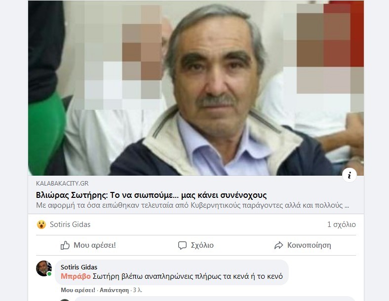 Την δική του απάντηση έδωσε ο Τοπικός Σύμβουλος και μέχρι πρόσφατα Ειδικός Συνεργάτης του Δημάρχου Σωτήρης Γίδας, στο άρθρο του Σωτήρη Βλιώρα που φέρει τον τίτλο “Το να σιωπούμε… μας κάνει συνένοχους” που το υπογράφει ως Συνεργάτης του Δημάρχου του Δήμου Μετεώρων.
