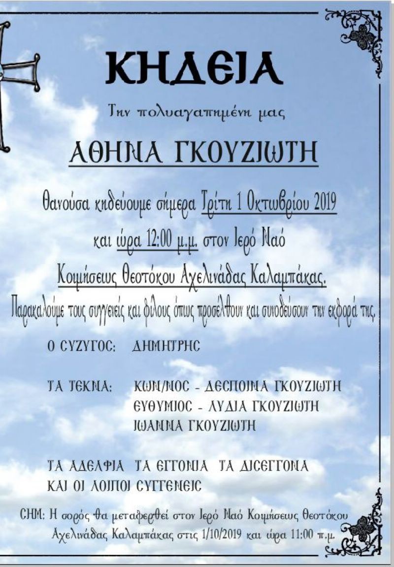 Την πολυαγαπημένη μας Αθήνα Γκουζιώτη θανούσα κηδεύουμε την Τρίτη 1η Οκτωβρίου και ώρα 12:00 το μεσημέρι στον Ιερό Ναό κοιμήσεως Θεοτόκου Αχελινάδας Καλαμπάκας.