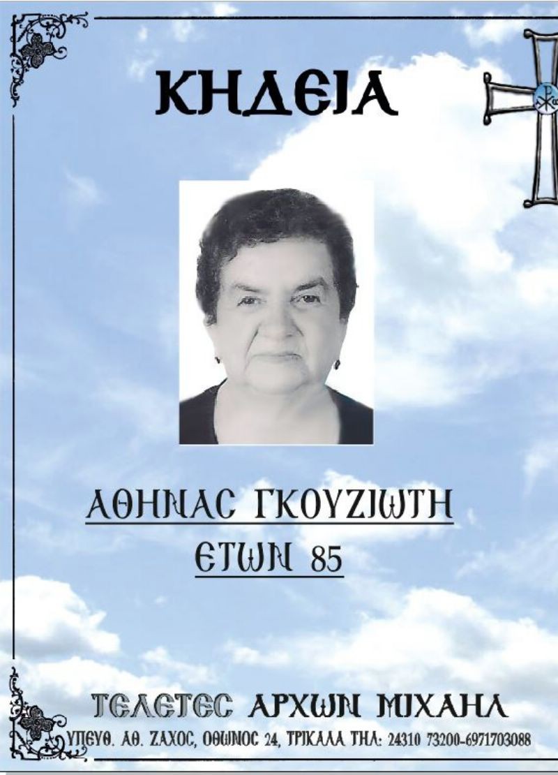Την πολυαγαπημένη μας Αθήνα Γκουζιώτη θανούσα κηδεύουμε την Τρίτη 1η Οκτωβρίου και ώρα 12:00 το μεσημέρι στον Ιερό Ναό κοιμήσεως Θεοτόκου Αχελινάδας Καλαμπάκας.