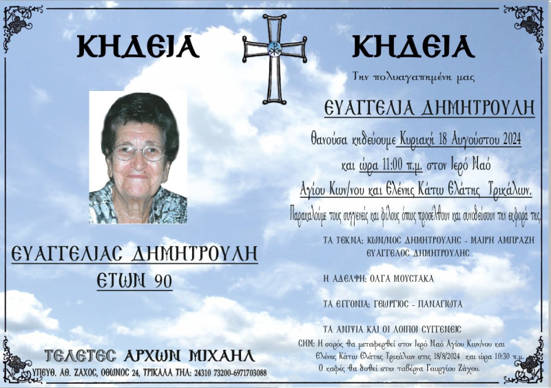 Η κηδεία θα γίνει την Κυριακή 18 Αυγούστου και ώρα 11:00 π.μ. από τον Ιερό Ναό Αγίων Κωνσταντίνου και Ελένης Κάτω Ελάτης Τρικάλων.