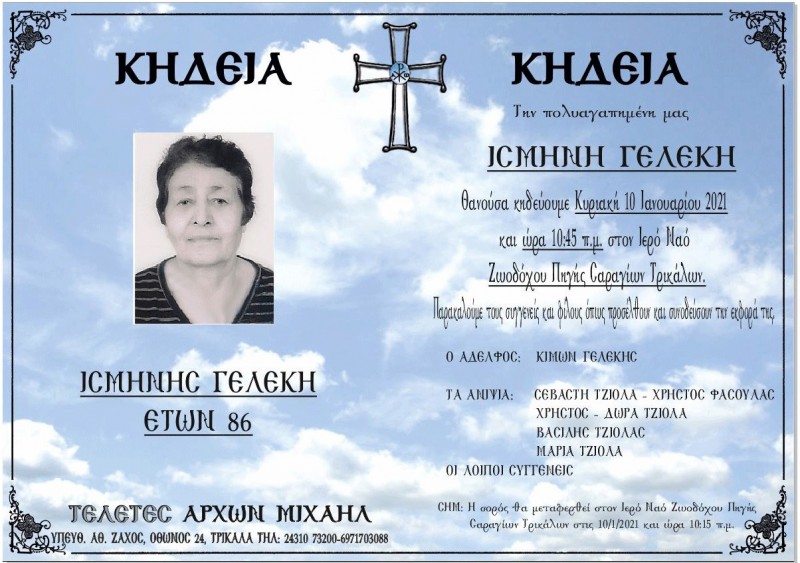Απεβίωσε η Ισμήνη Γελέκη Ανακοινώσεις Από admin Δημοσίευση Ιαν 9, 2021 -18:22 0 1.237 Κοινοποίηση FacebookTwitterΗλεκτρονικό ΤαχυδρομείοViber Απεβίωσε σε ηλικία 86 ετών η Ισμήνη Γελέκη. Η κηδεία της θα γίνει την Κυριακή 10 Ιανουαρίου και ώρα 10:45 π.μ. από τον Ιερό Ναό Ζωοδόχου Πηγής Σαραγίων Τρικάλων. 0 1.237 Κοινοποίηση