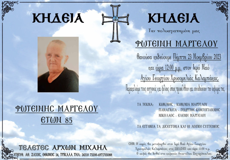 Κηδεύεται την Πέμπτη 23 Νοεμβρίου 2023 και ώρα 12:00 μ.μ. στον Ιερό Ναό Αγίου Γεωργίου Χρυσομηλιάς Καλαμπάκας.