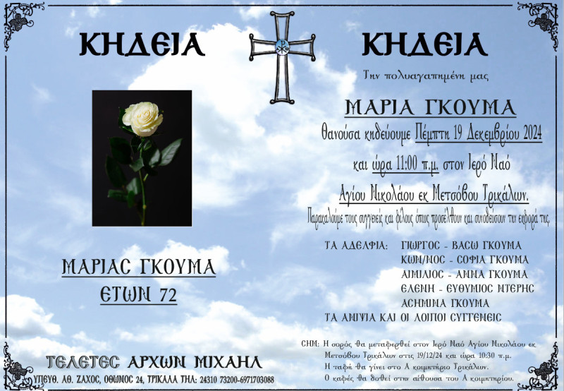 Κηδεύεται την Πέμπτη 19 Δεκεμβρίου 2024 και ώρα 11:00 π.μ. στον Ιερό Ναό Αγίου Νικολάου εκ Μετσόβου Τρικάλων.