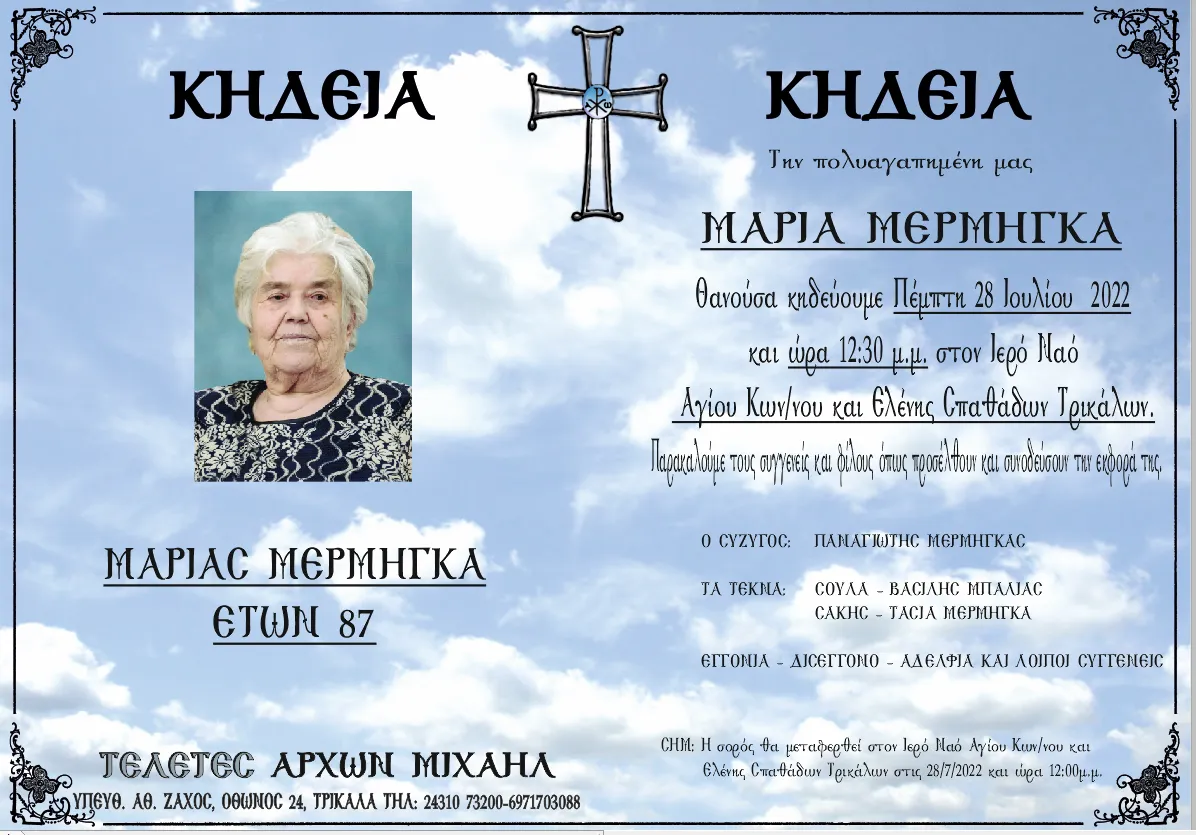 Απεβίωσε η Μαρία Μέρμηγκα Ανακοινώσεις Από admin Δημοσίευση Ιούλ 27, 2022 -22:51 0 1.932 Κοινοποίηση FacebookTwitterΗλεκτρονικό ΤαχυδρομείοViber Απεβίωσε η Μαρία Μέρμηγκα σε ηλικία 87 ετών. Η κηδεία της θα γίνει την Πέμπτη 28 Ιουλίου και ώρα 12:30 μ.μ. από τον Ιερό Ναό Αγίων Κωνσταντίνου και Ελένης Σπαθάδων Τρικάλων. 0 1.932 Κοινοποίηση